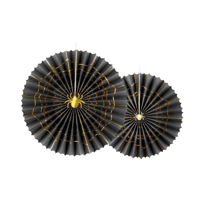 Zwei Rosetten mit unterschiedlichen Abmessungen. Sie sind schwarz und verziert mit einer Spinne in der Mitte und rundum mit goldenen Fäden geschmückt, um das Spinnennetz zu bilden. Diese hübschen Rosetten, die in verschiedenen Höhen aufgehängt werden können, oder an Ihrem Buffetschrank angebracht werden können, sind eine tolle Halloween-Dekoration!