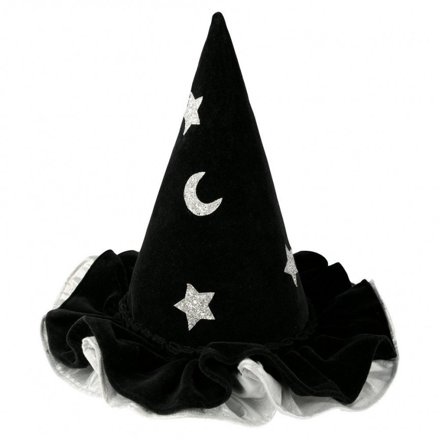 Dieser weiche Hexenhut aus schwarzem Samt mit Rüschendetails, silbernem Lamé-Gewebe und silbernen Glitzersternen und -monden ist ein unverzichtbares Accessoire für Halloween oder zu jeder Jahreszeit, um ein fantasievolles Spiel zu verkleiden!