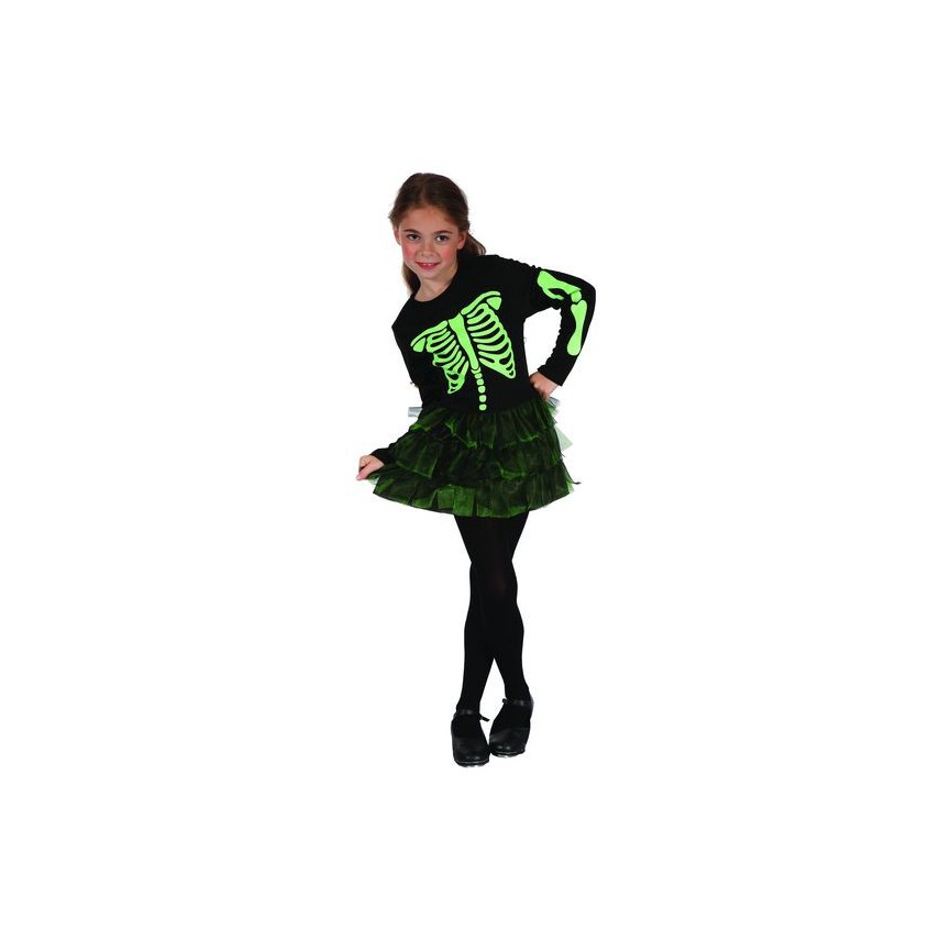 Diese Verkleidung umfasst ein Kleid, dessen Oberteil mit einem Skelett-Thorax und die Ärmel mit Knochen bedruckt sind, und der seidige grüne Rock ist mit Tüll verziert. Strumpfhose nicht enthalten.