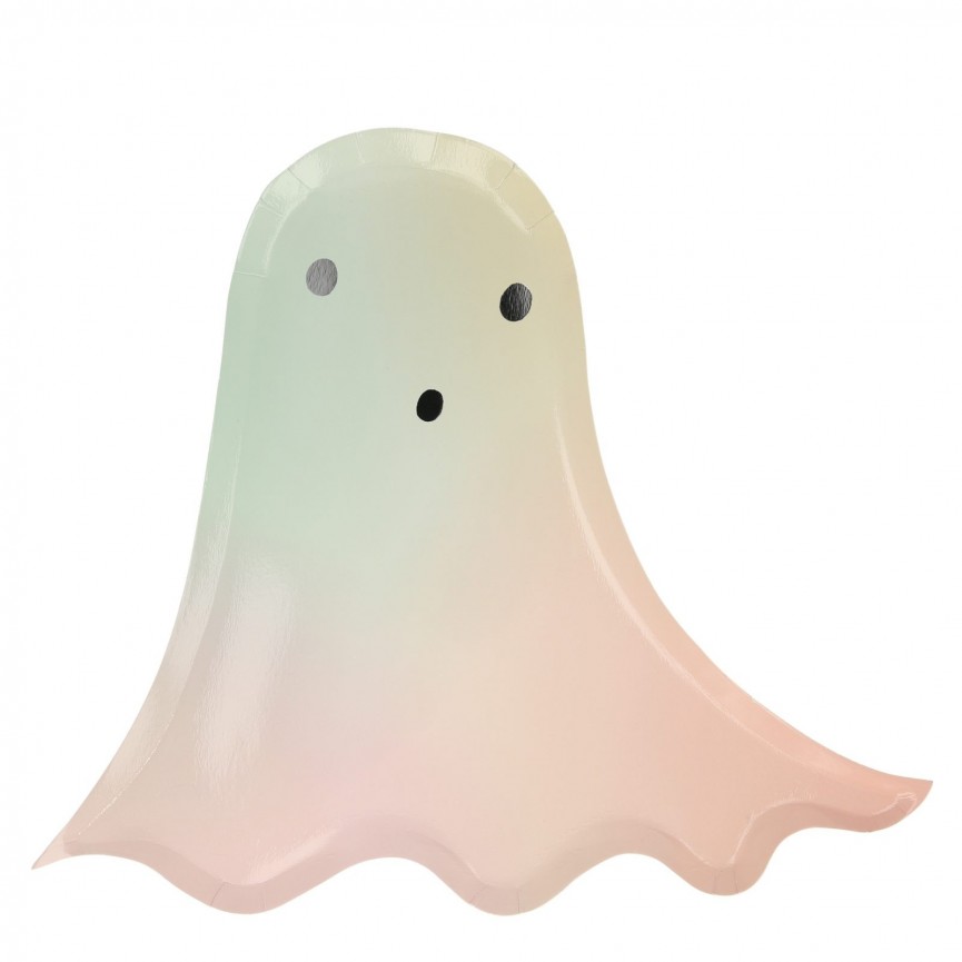 Diese reizenden Geisterteller verleihen Ihrem Halloween-Partytisch einen Hauch von Farbe. Sie haben ein schattiertes Pastell-Design in Mint, Pfirsich und Pink, und die Augen und der Mund sind aus schimmernder Silberfolie. Auch als Dekoration sehen diese Teller toll aus!