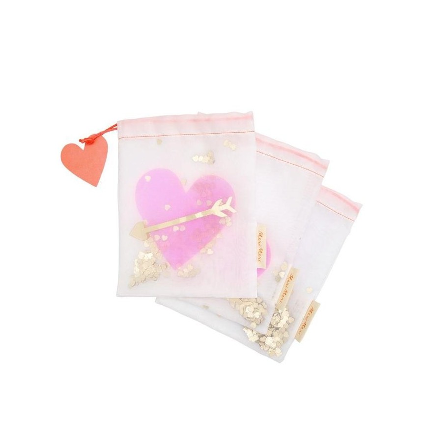 Ein großes rosa Herz und ein goldener Pfeil schmücken diese schönen Stoffbeutel der Marke Meri Meri. Jede Tasche hat ein herzförmiges Etikett und Pailletten im Futter. Ein Accessoire das von Herzen kommt !