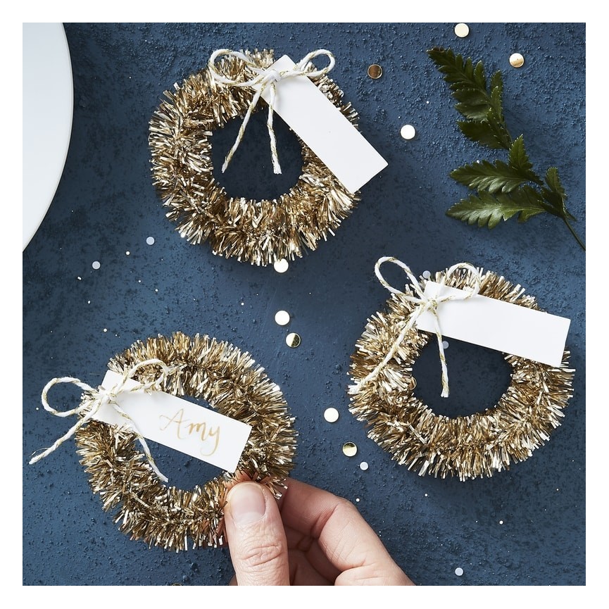 Decken Sie einen stilvollen Weihnachtstisch mit diesen glitzernden, goldenen Minikränzen mit einer Platzkarte. Eine großartige Möglichkeit, um sicherzustellen, dass Ihre Gäste den perfekten Platz um Ihren Tisch haben!