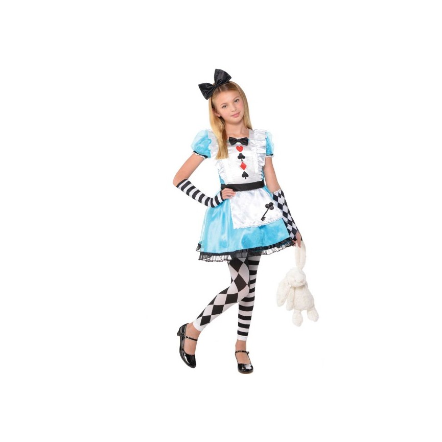This beautiful disguise of Alice in Wonderland includes a sky blue dress with puff sleeves, the top with frills and the bottom of an apron. Black and white legging, matching cuffs and a black bow tie headband complete this refined costume.