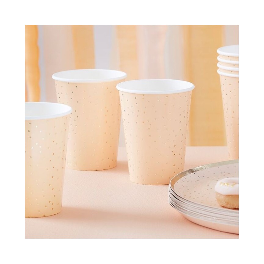 Ces jolis gobelets de couleur pêche maculées de délicates tâches dorées métallisées sont hyper tendance. Il sublimeront et illumineront votre table en délicatesse tout en ajoutant une touche de rose chic et moderne à votre fête!
