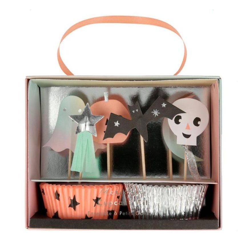 Ce kit de cupcake comprend 6 modèle de toppers (décorations) avec 4 modèles de chaque : crâne, chauve-souris, étoile, citrouille, fantôme et croissant de lune. Il contient également 24 étuis de cupcake en 2 modèles: 12 en feuille d'argent et 12 en couleur corail avec des étoiles noires. Il est parfait pour créer les friandises d'Halloween les plus étonnantes!