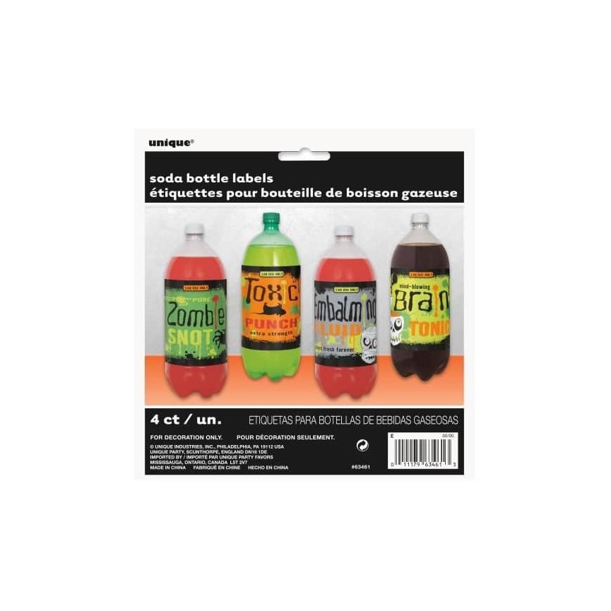 Habillez vos boissons avec ces 4 étiquettes adhésives avec des noms effrayants comme Toxic Punch et Brain Tonic. Collez-les directement sur vos bouteilles de 2 litres. Avec leurs couleurs néon et leurs designs spooky! Avec leurs désigns rétro et leurs noms terrifiants ils apporteront style et effroi à votre fête!! Bois si tu oses! Paquets de 4 étiquettes adhésives.
