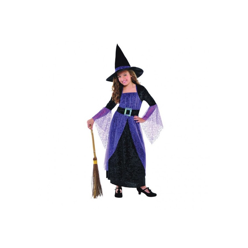 Un breuvage vraiment magique, ce déguisement ! Il se compose d'une robe en velours noir d'une longueur jusqu'à la cheville, recouverte d'un voile violet avec des tourbillons brillants. Les manches sont également en voile violet, et la robe dispose d’une ceinture attachée avec une boucle en tissu irisé. Le top de ce joli costume de sorcière est le chapeau de velours noir assorti !