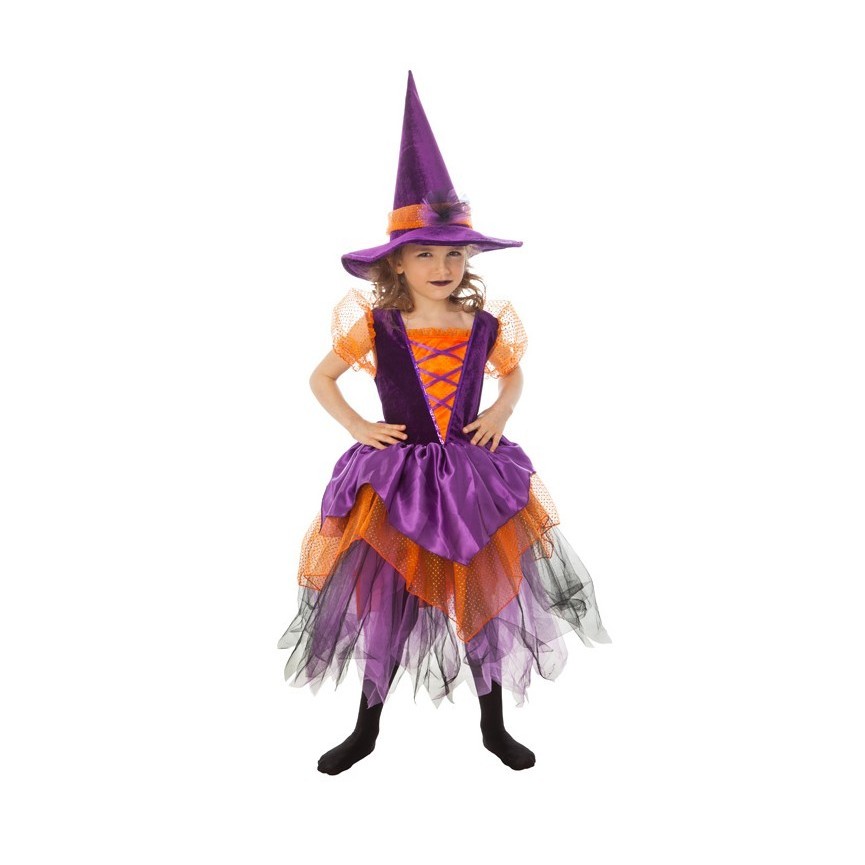 Ce joli déguisement comprend une robe composé d'une jupe de plusieurs couches en voile et dentelle, de courtes manches bouffantes voilées et d'un corsage lacé. La tenue est complétée par un magnifique chapeau pointu qui donne un look magiquement envoûtant!