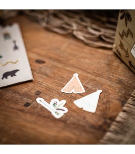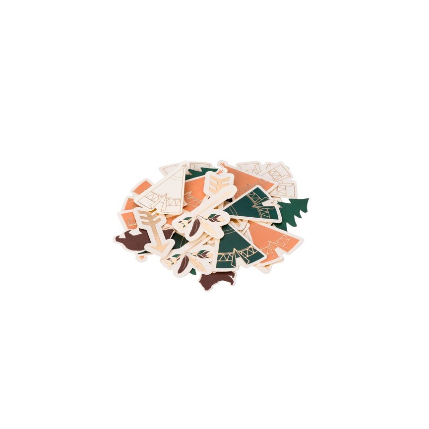 Entdecken Sie den Indianerwald mit diesem herrlichen Konfetti mit Tipis, Pfeilen, Bergen und Bäumen. Einfach auf Ihren Tisch streuen, um den Kuchen, in die Geschenktüten Ihrer Gäste, in die Piñata und sogar in die Einladungen, und schon verleihen sie eine indianische Note !