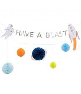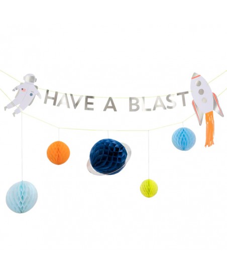 Diese Dekoration besteht aus 2 Girlanden. Eine mit der Aufschrift „have a blast“ und die andere mit farbigen Planeten in Wabenpapier. Eine perfekte Deko für Ihre Wände, oder zum Aufhängen am Eingang Ihres Wohnraumes, um Ihre kleinen Astronauten und Kosmonauten willkommen zu heißen und sie während der Geburtstagszeit reisen zu lassen!