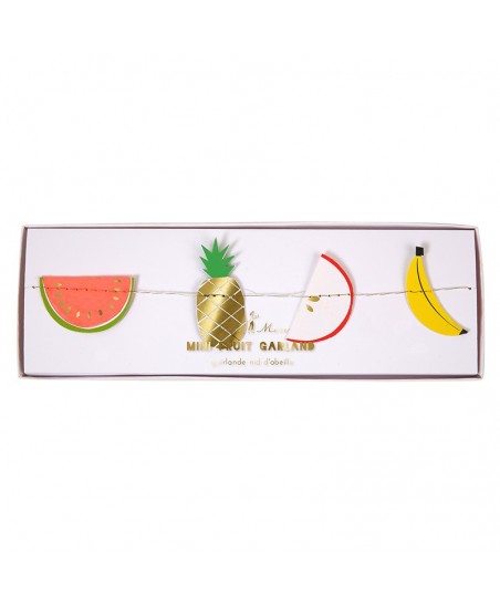 Mit dieser schönen Girlande aus Mini-Früchten von geschmackvollen Farben surfen wir auf einer tropischen Tendenz. Sie wird Ihrer Party Sonnenschein und Vitamine verleihen ! Meri Meri. 4 Meter lange Girlande mit 56 Papierfähnchen.