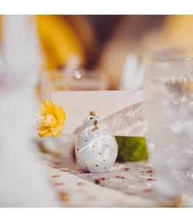 Diese entzückenden Hennen mit goldenen Glitzertupfen laden sich an Ihren Tisch ein! Verleihen Sie Ihrer Tischdekoration eine rustikale Note mit diesen entzückenden Platzhaltern in Form einer Henne mit Federn.
