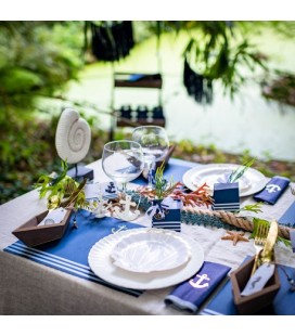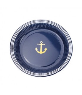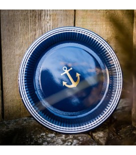 Diese eleganten marineblauen Teller sind mit einem goldenen Anker und einer Bordüre aus feinen weißen Streifen verziert. Sie sind perfekt für eine Party oder für einen Abend zum maritimen, nautischen Thema mit einer Athmospäre "An der See" !