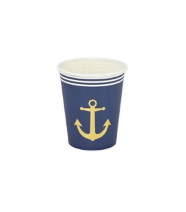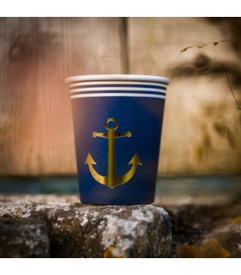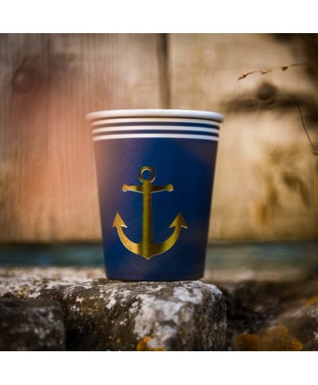 Diese eleganten marineblauen Becher sind mit einem goldenen Anker und einer Bordüre aus feinen weißen Streifen verziert. Sie sind perfekt für eine Party oder für einen Abend zum maritimen, nautischen Thema mit einer Athmospäre "An der See" !
