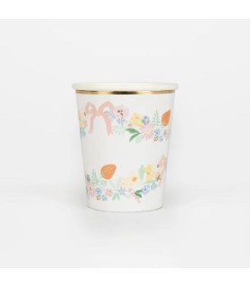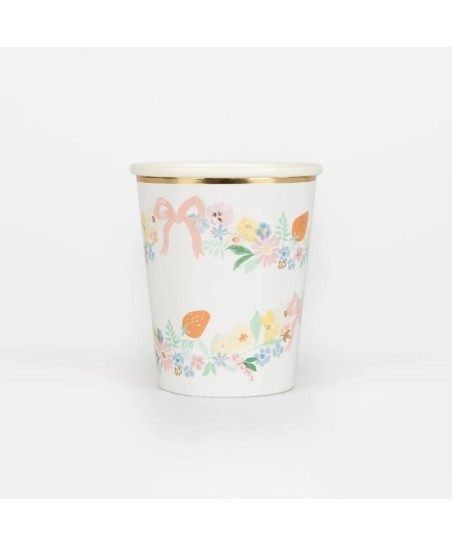 Diese Becher mit hübschenAquarellblumen und -erdbeeren sind mit ihren goldenen Details und eleganten Schleifen der Inbegriff von Eleganz. Die Becher werden Ihre Festdekoration abrunden und Ihrem Fest den Frühling näher bringen. Dank den schönen Pastellfarben passen sie zu jedem Anlass!