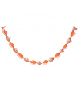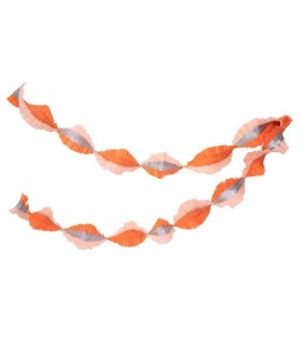 Was könnte einfacher und wirksamer sein als eine bunte Girlande für die Dekoration Ihres Halloween-Partyraums? Hier ist eine ganz besondere, aus einem atemberaubenden Trio aus orangem, glänzend silbernem und pfirsichfarbenem Krepppapier, die mit einem weißen Faden zusammengenäht ist. Die Wirkung ist toll !