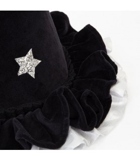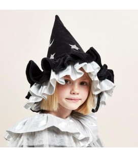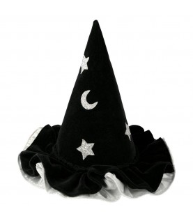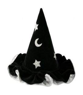 Dieser weiche Hexenhut aus schwarzem Samt mit Rüschendetails, silbernem Lamé-Gewebe und silbernen Glitzersternen und -monden ist ein unverzichtbares Accessoire für Halloween oder zu jeder Jahreszeit, um ein fantasievolles Spiel zu verkleiden!