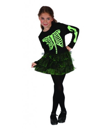 Diese Verkleidung umfasst ein Kleid, dessen Oberteil mit einem Skelett-Thorax und die Ärmel mit Knochen bedruckt sind, und der seidige grüne Rock ist mit Tüll verziert. Strumpfhose nicht enthalten.