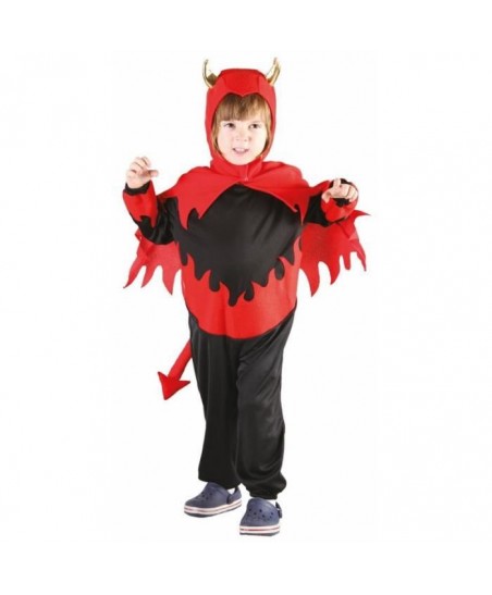 Dieses kleine Teufelskind trägt eine Verkleidung, die einen Anzug mit Flügeln, einen Schwanz und eine Kapuze umfasst.