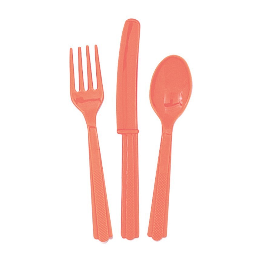 Die Packung enthält 18 Plastik-Besteckteile in korallenroter Farbe, d.h. 6 Löffel, 6 Gabeln und 6 Messer.