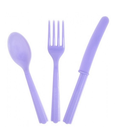 Die Packung enthält 18 Plastik-Besteckteile in lavendelblauer Farbe, d.h. 6 Löffel, 6 Gabeln und 6 Messer.