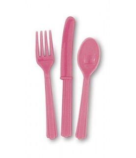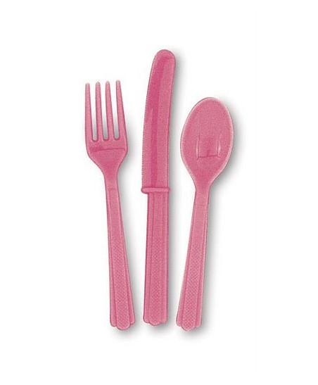 Die Packung enthält 18 Plastik-Besteckteile in magentaroter Farbe, d.h. 6 Löffel, 6 Gabeln und 6 Messer.