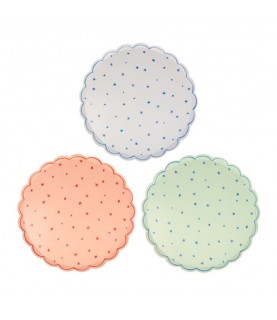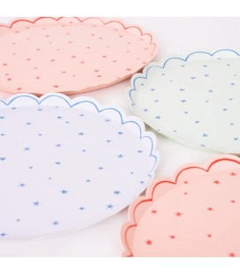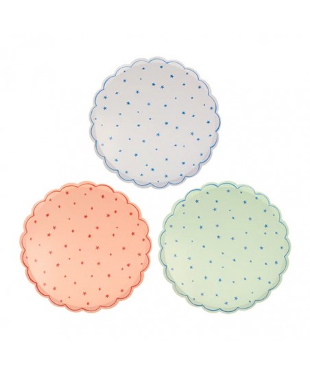 Wenn Sie eine Party zwischen Mädchen und Jungen organisieren, dann können Sie diese Teller in Rosa, Blau und Minzgrün, mit Sternen verziert und mit stilvollem Muschelrand wählen. Sie sind auch perfekt für Babypartys.
