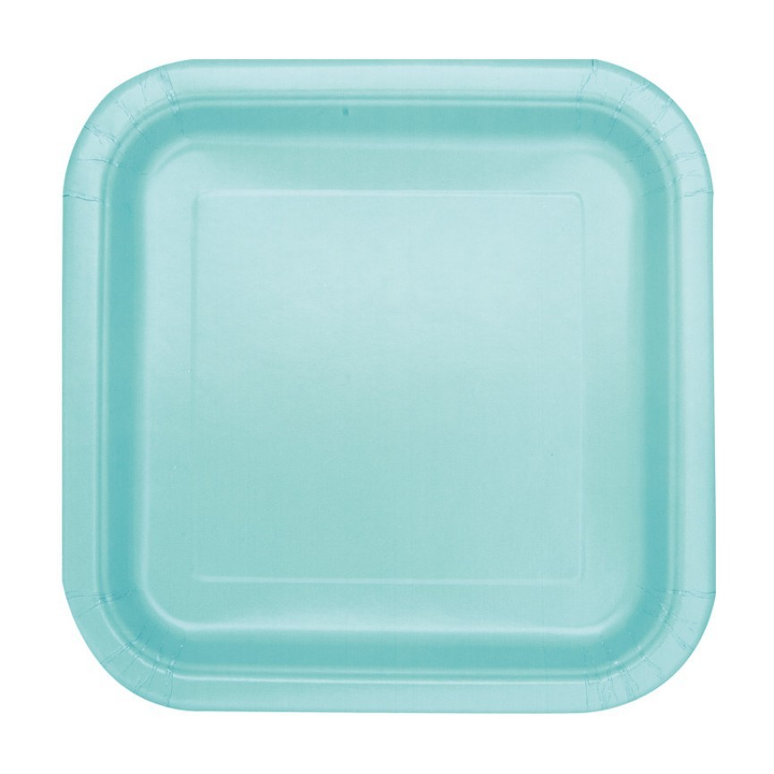 Jede Packung enthält 14 kleine rechteckige minzgrüne Pappteller.
