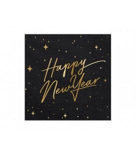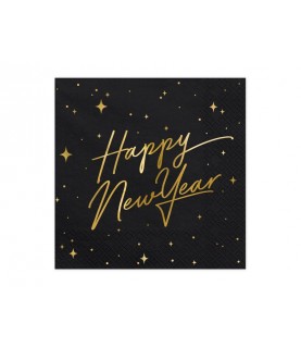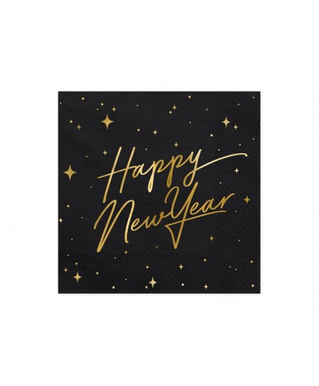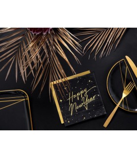 20 große schwarze Papierservietten mit goldenem Metallic-Aufdruck und den Wörtern "Happy New Year". Diese Servietten sind perfekt für einen Neujahrstisch !