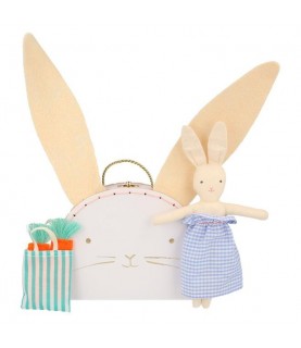 Sie suchen ein Geschenk, perfekt für Ostern oder für einen ganz besonderen Moment im Jahr? Die Kleinen werden entzückt sein, den wunderschön gestalteten Hasen-Koffer zu öffnen, um eine süße kleine Baumwoll-Hasenpuppe zu entdecken, mit einem schönen blauen Kleid im Vichy-Muster, und die eine Einkaufstasche mit 2 Karotten aus Filzstoff trägt. Ein fabelhaftes Geschenk, um jederzeit zu spielen und Abenteuer zu erleben!