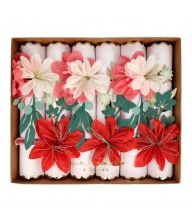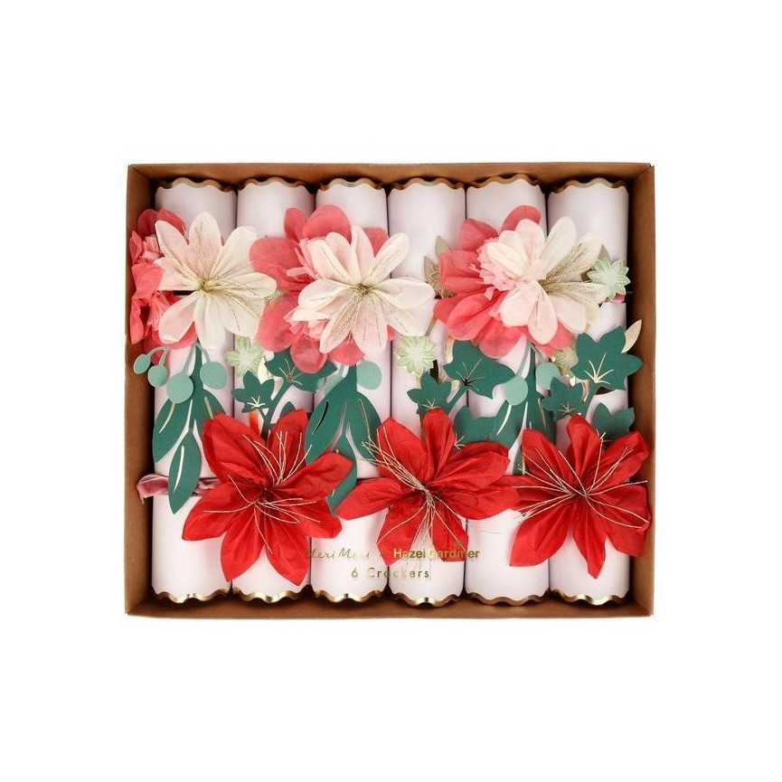Hazel Gardiner, eine talentierte Blumendesignerin aus London, hat mitgearbeitet, um diese wunderbaren Knallbonbons zu schaffen. Sie haben rosa, rote und gelbe Seidenpapier-Blumen und mit Goldfolie umrandete Jakobsmuschelränder; sie werden bei festlichen Anlässen absolut fantastisch aussehen. Jeder Knallbonbon enthält einen Scherz, einen goldenen Papierhut und eine Holzbrosche mit Goldfoliendetail.