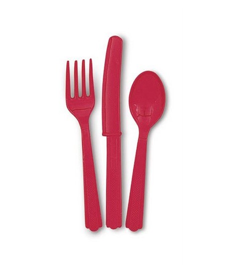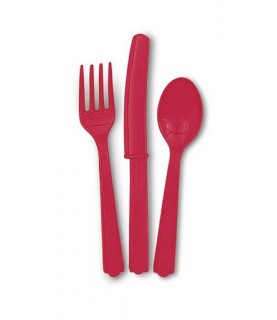 Die Packung enthält 18 Plastik-Besteckteile in roter Farbe, d.h. 6 Löffel, 6 Gabeln und 6 Messer.