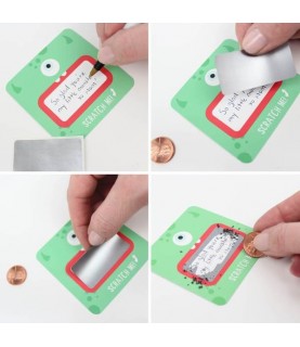 Überraschen Sie Ihre geliebten Personen mit diesem Satz von 18 Rubbelkarten. Einfach zu realisieren, schreiben Sie Ihre Nachricht und bedecken Sie sie mit der mitgelieferten silbernen selbstklebenden Folie. Einfach kratzen, um die geheime Botschaft zu enthüllen! Diese kleinen Karten sind perfekt, um sie in eine Handtasche, eine Snackbox, eine Schultasche oder eine Hosentasche zu stecken, für eine schöne Überraschung, die ihre Wirkung erzielen wird!