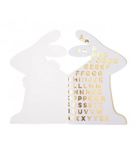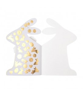 Der Buchumschlag kennzeichnet einen schönen Hasen mit Blumen und Goldfolie-Einzelheiten. Das Buch hat 32 bunte Seiten in Pink, Blau, Gelb und Weiß und enthält 6 Seiten Aufkleber mit ikonischen Frühlingsmotiven von Kaninchen, Karotten, Eiern, Vögeln und Blumen sowie Buchstaben aus dem Alphabet.