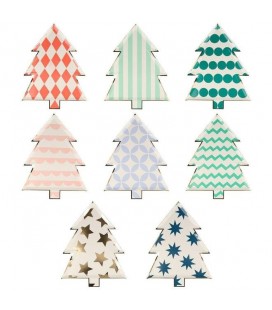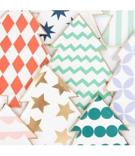 Weihnachtsbäume sind ein fabelhaftes Design für festliches Partygeschirr, besonders wenn sie mit entzückenden Mustern verziert sind. Diese tannenbaumförmigen Teller haben jeweils unterschiedliche Designs und Farben und alle haben einen glänzenden Goldfolienrand für eine stilvolle Note.