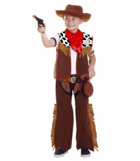 Dieses tolle Cowboy-Verkleidungskit besteht aus einer Weste und einer Cowboy-Hose mit Fransen. Diese Verkleidung wird vervollständigt mit einem Gürtel, einem Hut, einem Halstuch, einem Abzeichen, 2 Revolverholster, 2 Pistolen und einer Gürtelflasche.