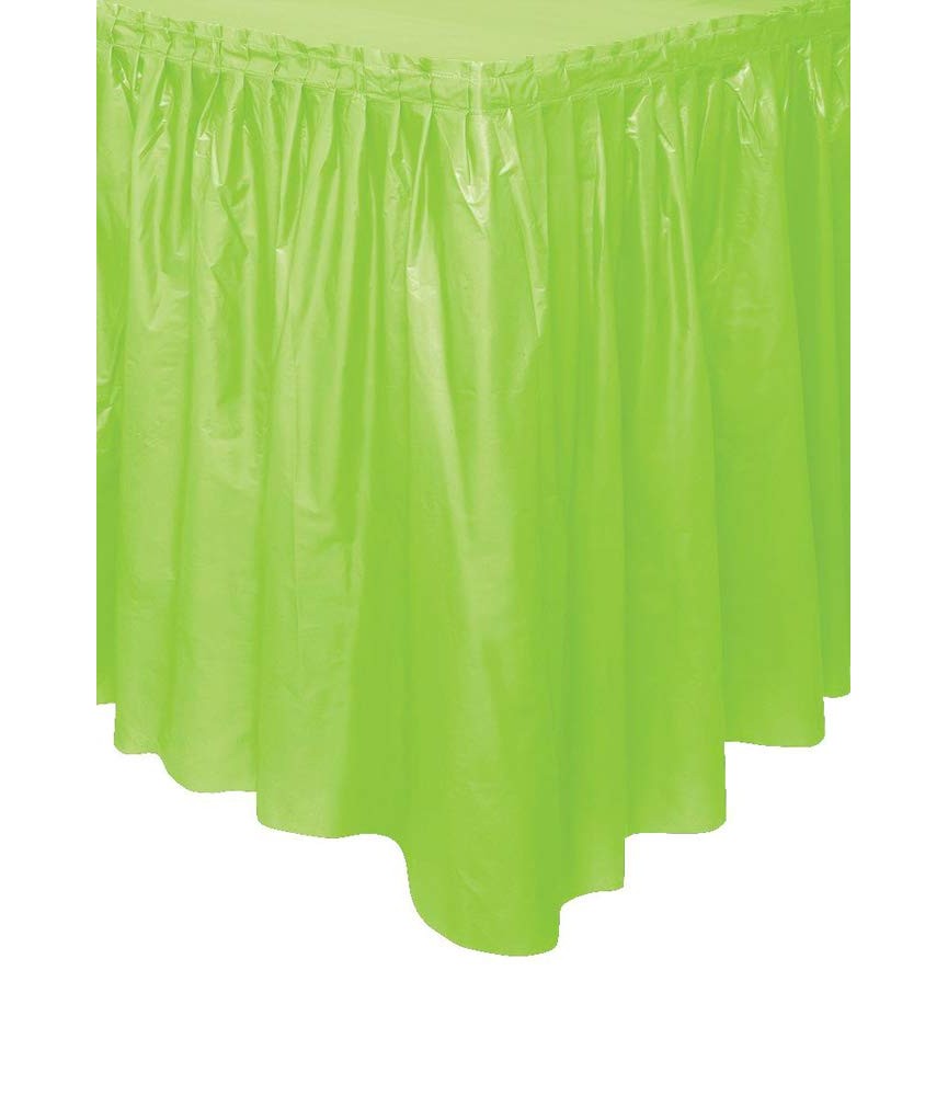 Zitronengruener Tischrock aus Plastik mit Klebeband auf der Rueckseite.