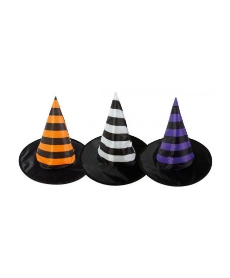 Hexenhut aus gestreiftem Stoff für Kinder. Das unverzichtbare Accessoire für all die kleinen Hexen, die in der Halloween-Nacht auf ihren Besen steigen, um die Stadt zu erschrecken!