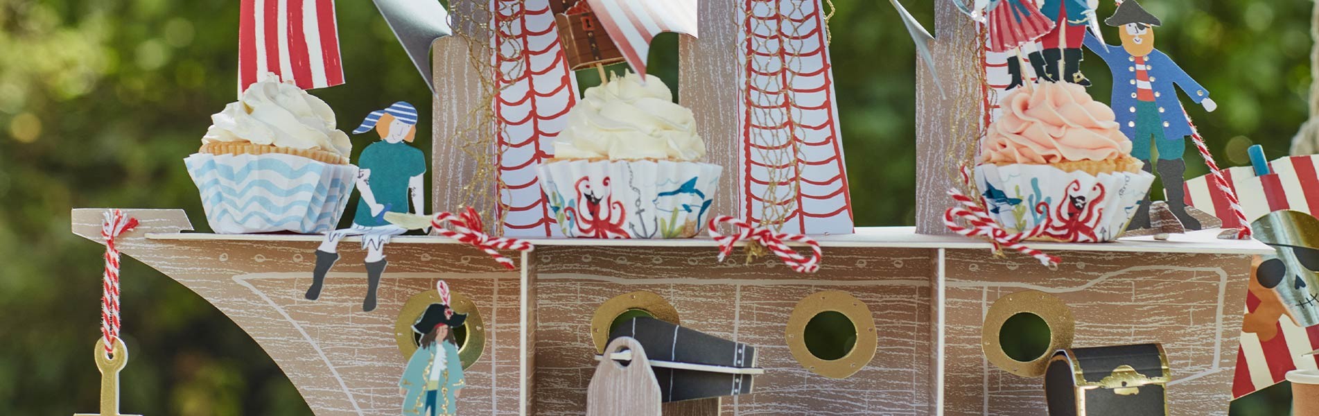 Price CHF 19.00Ahoy mateys, this beautifully illustrated pirate bounty centerpiece will look absolutely sensational on the party table. Featuring a ship with stripy sails, skull and crossbones flag, a shiny gold anchor, a host of pirate characters and it also serves as a cupcake stand.