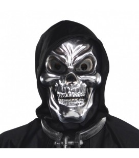 Our Silver Skull Mask features a skull design with exaggerated cheekbones, a chiselled chin, black eyes, and bared teeth. The Silver Skull Mask's brow is furrowed and its eyes wide open for a crazed and monstrous look. The plastic construction is lightweight and an elastic strap provides a comfortable fit.