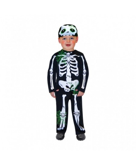 This Toddler Skeleton Costume features a skeleton hat, black jumpsuit with graphic skeleton bones.