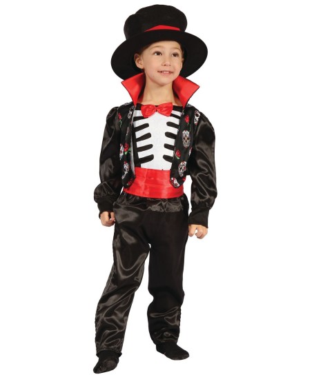 This "Day of the dead" kid costume, in luxury version, includes a satiny pants, the top with a satiny attached jacket that is printed with skulls, an attached red bow tie. It also includes a red belt and a hat.