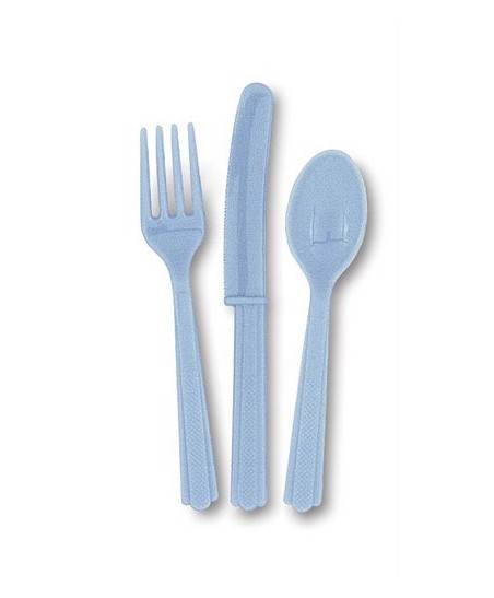 Each package contains 18 baby blue plastic cutlery: 6 forks, 6 spoons and 6 knives.
