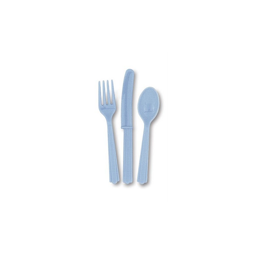 Each package contains 18 baby blue plastic cutlery: 6 forks, 6 spoons and 6 knives.