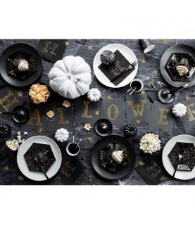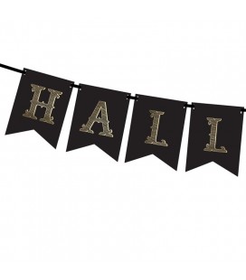 Announce the theme of the evening with this Halloween garland! Black garland consisting of 9 pennants making up the word "Halloween" in golden letters.