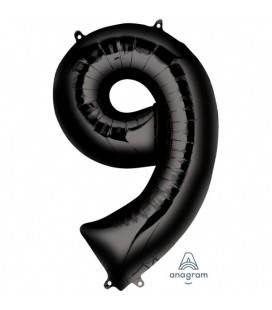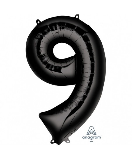 Black "Super Shape" metallic Mylar balloon that will decorate and indicate with style the number 9!