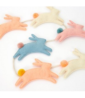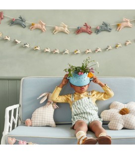 Make your Easter, or springtime party look amazing with this gorgeous garland. It features 8 padded marl felt bunnies in pastel colors, like dusky pink, blue, peach and pale yellow. Simply hang it up for a fabulous decoration, you and your guests will adore. It comes packed in a delightful cotton organdie bag, so makes an excellent gift too.