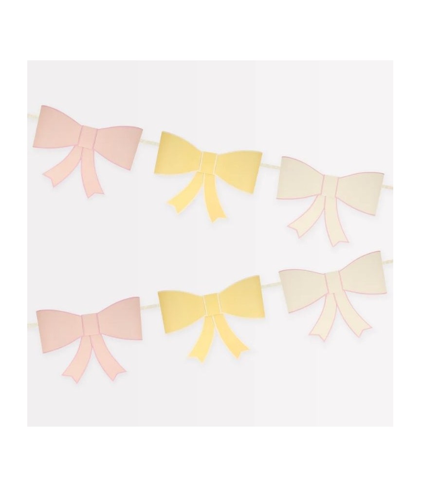 Bows are back and they're big! Make your room look stylish in seconds with this supersized 3D paper bow garland. Hang it on the wall, above the mantel, in the porch or on the party table for a statement decoration. This Meri Meri elegant bow garland will look truly beautiful at any party, or for decorating your home with. A really lovely decoration for a any kind of party.