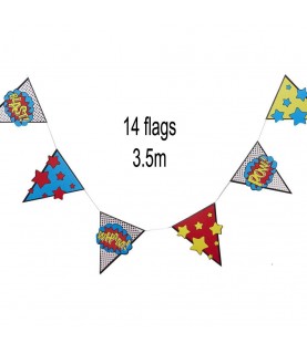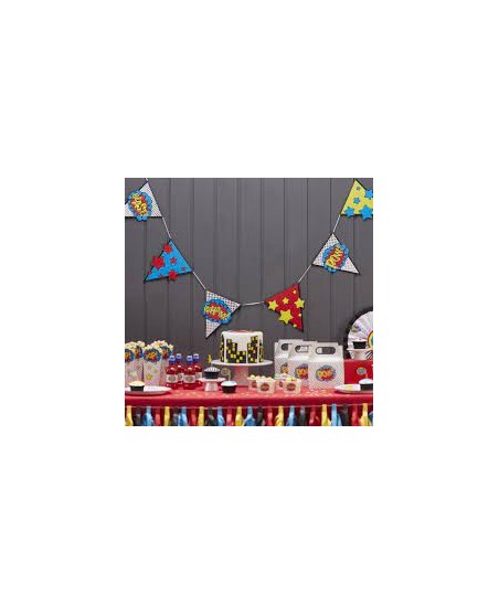 Super Heroes Party flag paper banner. Great for a kids superhero themed party ! Also cute to use as a bedroom decoration after a party ! Length : 3.5 m.