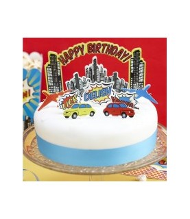 This kit contains 11 cake decorations in the shape of cars, planes and buildings with a banner Happy Birthday. Without icing, you just have to put the decoration on the cake ! Great for a birthday party of a Super Hero !